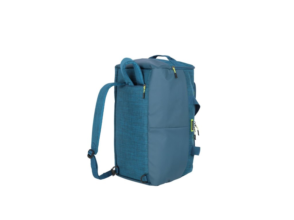 Moderní multifunkční cestovní taška s ramenními popruhy pro nošení na zádech vyrobená ze dvou různě barevných polyesterových tkanin.