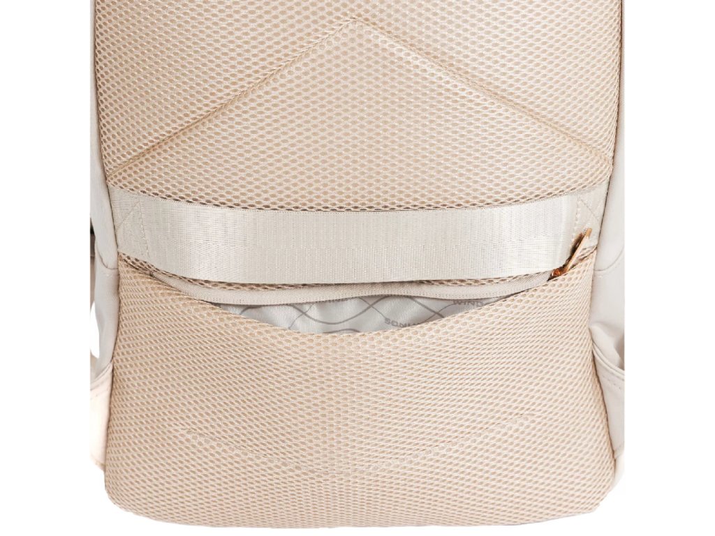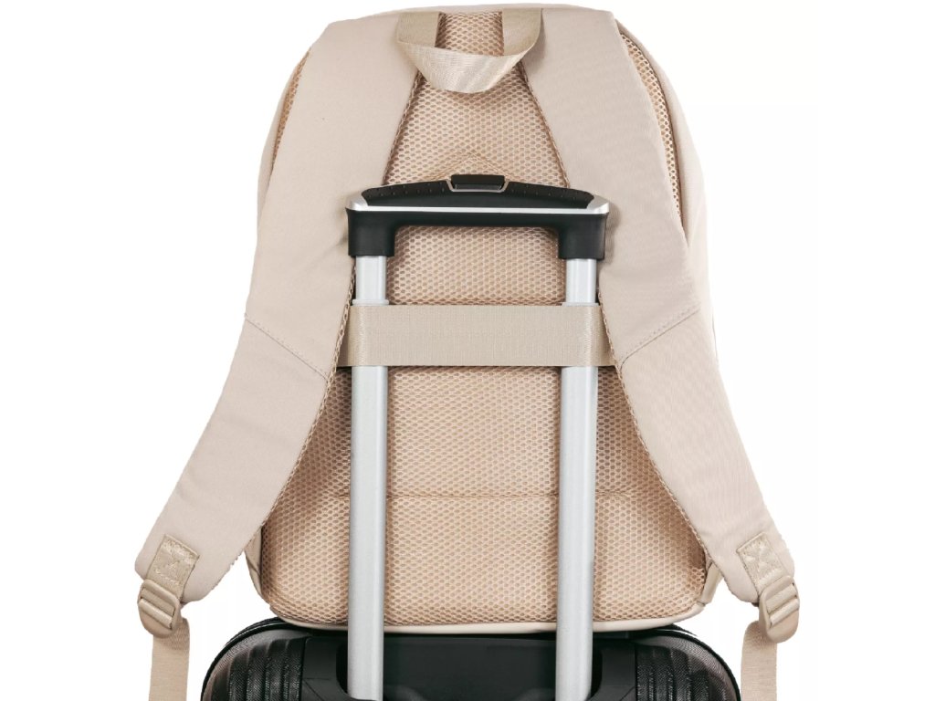 Funkčnost batohu je umocněna praktickými řešeními. Záda a rukojeti jsou potaženy měkkou pěnou a prodyšnou síťovinou, což zajišťuje pohodlí i při delším nošení. Popruh na kufr vzadu umožňuje snadné připevnění k zavazadlu a skrytá kapsa na zádech poskytuje bezpečné místo pro cennosti.