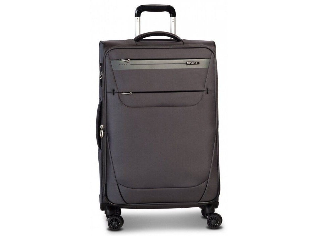 Cestovní čtyřkolečkový látkový kufr uzavíratelný zipem.