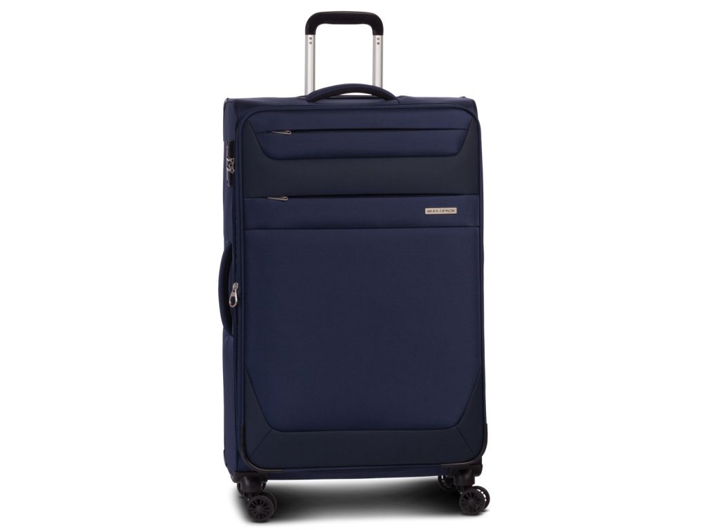 Cestovní čtyřkolečkový látkový kufr uzavíratelný zipem.
